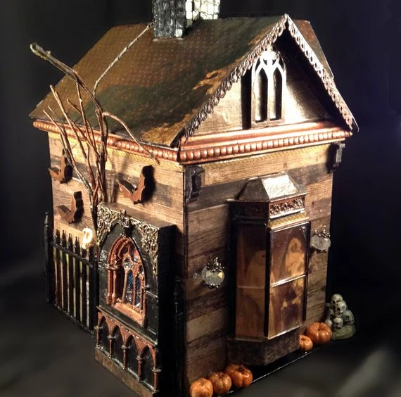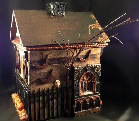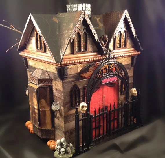 A spooky Halloween house just for you! A gargoyle sits in the front eaves to welcome visitors. The fence is decorated with skulls, and pumpkins litter the yard. A ghost family can be seen through one window while a skeleton can be seen through another. Bats flutter around.