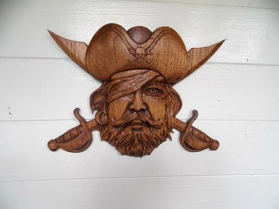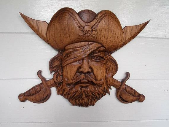 LISTING DETAILS: 3D Wooden Pirate with Hat and Crossed Swords Wood Carving