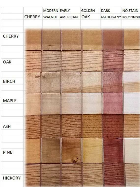 Custom orders allow you the freedom to pick your wood species, stain preference, size and budget from the drop-down boxes to the left of the listing photo. The last photo is a chart to help you with the stain color on the different types of wood as a guideline.
