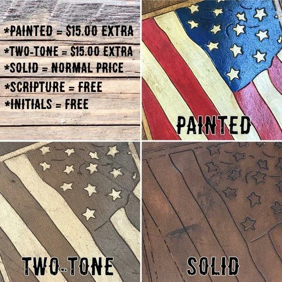 – Painted means that the leather has been hand painted as shown in the fourth image. Red, white, and blue are the colors that we will paint the leather unless you would like a different color. If you would like different colors please specify in the notes to seller.
