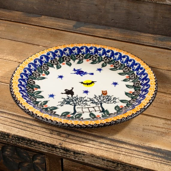 We team up with our Polish artisans to bring you each special edition Halloween dinner plate that can only be found at Uno Alla Volta. Each meticulously adorned plate is hand-painted using hand-carved sea sponges and fine brushwork to create vibrant symbols of Halloween. To preserve these detailed images our artisans glaze each plate and fire at high temperatures to bring you an everlasting beauty you will want to display for years to come. No two will be exactly alike. Designed by Uno Alla Volta and handcrafted in Boleslawiec, Poland.