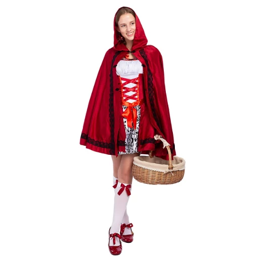 Checkout Women Little Red Riding Hood Costumes for Halloween includes Red Dress, Cape with Attached Hood, and Two Arm Bands made up of polyester. Order now!